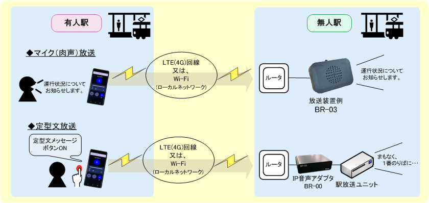 ■スマートフォンをマイクの代わりに放送用の操作端末として利用し、リモートで駅の放送装置にマイク(肉声)放送が行えるシステムです。